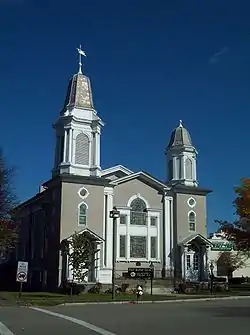 First Baptist Church of Painted Post is a historic Baptist church located at Painted Post in Steuben County, New York. The church was originally built in 1860 and expanded and remodeled in 1915 after a fire destroyed the mid-19th century building's tower and spire. The three-part church consists of the main block—a 40-foot-wide (12 m), 60-foot-deep (18 m), gable-roofed edifice built in 1860 and now containing the sanctuary; the front wing—a 40-foot-wide (12 m), 12-foot-deep (3.7 m) addition built in 1915 and now containing the foyer and narthex; and a noncontributing rear addition. The front wing features two massive square corner towers surmounted by louvered bell towers and bell curved roofs.[2]