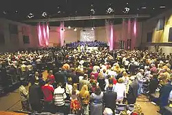 In February 2011, Regions Financial Corporation filed a foreclosure petition on the church. The bank requested the church be placed in receivership, claiming the church owed $14.4 million on two loans. The elders of the church stated that even while the FFC was current in its monthly payments, Regions Bank accelerated the mortgage maturity from 30 to five years due to the 2008 banking crisis and demanded the full payment of the loan.[5] The elder board stated that AG Financial made a cash offer to Regions Bank to finance First Family Church's mortgage, but Regions Bank rejected the offer.[26] Regions Financial Bank had not yet repaid the 2008 TARP (Troubled Asset Relief Program) loan from the federal government when it sold First Family Church's loan to Blue Valley School District. The bank paid back its $3.5 billion in the spring of 2012.[27] Part of the bank's filing mentioned the church had a payroll of $915,000 a year, with over $600,000 of that going to the Johnston family.[28][29] On September 5, 2011, Jerry Johnston announced the church was losing its building. 2011 marked a dramatic increase of church property foreclosures; 138 churches were sold by banks compared to just 24 in 2008.[30] The church started hosting services at Olathe East High School and changed its name to New Day Church Kansas City.[31] New Day Church Kansas City closed down September 2012.
