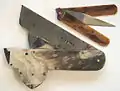 Early craftsmen often varied the number of blades, the types of materials used for the bolsters, and the types of instruments included in the bolster for patient care. Pictured to the right is a three-blade fleam with a horn handle made in Scotland by the Sanderson craftsmen. This piece has a thumb lancet in one shield of the bolster and a thumb forceps in the other. Controversy exists among collectors of antique surgical instruments that these types of fleams were made with the lancet so that rural families could bleed the animals and family members alike. Although there are descriptions of the use of thumb lancets in horses for opening the facial vein and for bleeding cats and dogs, the dimensions of the lancets fitted into fleams fit the dimensions of those described by Kirkup for human use.[4][6]