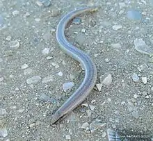 A unique lizard adapted to an underground existence, the Florida sand skink measures 10 to 13 cm (4 to 5 in) in total length and is a gray to tan color. Its forelegs are tiny and bear only one toe each; its hindlegs are small and have two toes. The tail comprises about half of the animal's total length. The sand skink has a wedge-shaped head, a partially countersunk lower jaw, body grooves into which the forelegs can be folded, and small eyes which have transparent windows in the lower lids. These features enable the lizard to move through loose sand.[4]
