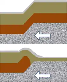 Fault propagation folds or tip-line folds are caused when displacement occurs on an existing fault without further propagation. In both reverse and normal faults this leads to folding of the overlying sequence, often in the form of a monocline.[12]