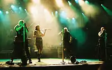 The German band Subway to Sally was formed in 1992 as a folk rock band, singing in English and incorporating Irish and Scottish influences in their music.[12] With their second album MCMXCV released in 1995, the band adopted a "more traditional approach" and started singing in German.[12] Taking Skyclad as an influence,[13] Subway to Sally performs a blend of hard rock and heavy metal "enriched with medieval melodies enmeshed in the songs via bagpipes, hurdy-gurdy, lute, mandoline, shalm [sic], fiddle and flute" and combined with "romantic-symbolic German-speaking poetry" in their lyrics.[14] With chart success in their native Germany,[12] they have since been credited as the band "that set off the wave of what is known as medieval rock."[15]