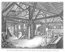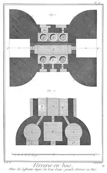 Besides the descriptions of Theophilus and Agricola, the only depiction of an early forest glasshouse is from Bohemia in approximately 1380 (The Mandeville Miniature).[3] This shows a furnace where all the high temperature processes of glassmaking were performed in the one structure containing several ovens whose varying temperatures might be controlled to the necessary extent by constant attention. The raw materials are mixed at a pit nearby and carried down in pans to be fritted in one of the ovens, optimum temperature up to 1100 °C. The frit is melted at high temperature up to 1400 °C in crucibles in a second oven, and when ready, the glass is being blown into objects. These are placed in the annealing oven to cool. The whole structure is enclosed in a wooden building, and it is likely that wood was stored and dried above the furnace.[15][16] Remains of a similar structure from the late fifteenth century have been found in Eichsfeld in Germany.[3] Another design found archaeologically from the seventeenth century is the 'butterfly furnace'. These furnaces were made from stone and the crucibles from imported, highly-refractory clay.[15] They differ in style from the Islamic furnaces of the east, and those of southern Europe, the 'beehive' style where the annealing chamber is above the main oven rather than on the same level.[1]