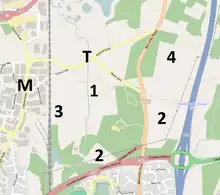 Forge Wood will be built in four phases.[20] The first phase will include most of the non-residential buildings, consisting of a community centre, shopping area, health centre and a 2,230-square-metre (24,000 sq ft) school building. Playing fields, a hard-surface games court and an area of parkland alongside the Gatwick Stream will also be created. Two new road links will be created: one leading on to Steers Lane to the north at Tinsley Green, and one on to the A2011 Crawley Avenue.[21] The "Phase 1" sector lies in the centre–west of the development area, wholly to the west of Balcombe Road. Phase 2 will occupy the southeastern part of the development area, east of Balcombe Road and south of a footpath which crosses the M23 motorway; a small area south of the Phase 1 development will also be added at this time. Phase 3 will form the westernmost part of the neighbourhood, between the already developed area and the railway line; and Phase 4 covers the northeastern part of the development area immediately north of the "Phase 2" sector. Two blocks of land totalling 5.18 hectares (12.8 acres) have been reserved for "possible future extension" at the north ends of the Phase 3 and Phase 4 areas. Other areas of undeveloped land not owned by the council totalling 11.99 hectares (29.6 acres) have also been identified.[20]