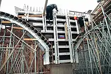 Climbing formwork is a special type formwork for vertical concrete structures that rises with the building process. While relatively complicated and costly, it can be an effective solution for buildings that are either very repetitive in form (such as towers or skyscrapers) or that require a seamless wall structure (using gliding formwork, a special type of climbing formwork).