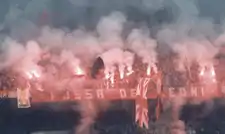 The association, after 38 years of activity, was officially dissolved in the date of 17 November 2005 by its members due to some polemics about two robbed banners after the match Milan-Juventus of 29 October 2005. During an internal conflict between Milan's supporters the Fossa dei Leoni was accused to collaborate with DIGOS[1] (unacceptable for ultras ideals) to obtain the restitution of the banners and some members of it was threatened and attacked. At the end of that conflict the leaders of the group decided to close the experience dissolving it.[2]