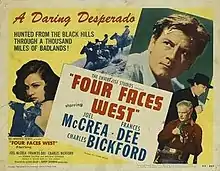 Four Faces West is a 1948 Western film starring Joel McCrea, his real-life wife Frances Dee, and Charles Bickford. It is based on the novel Pasó por aquí by Eugene Manlove Rhodes. Its plot concerns a down-on-his-luck cowboy who robs a bank. For its genre the film is unusual in that not a single shot is ever fired.