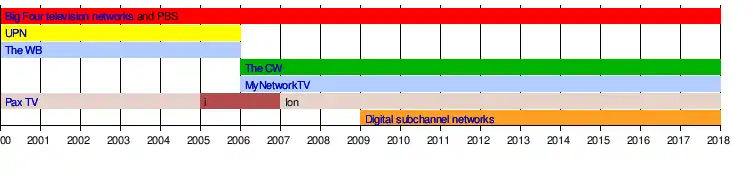 In September 2006, UPN and The WB ended operations, and their respective parent companies (CBS Corporation and Time Warner) decide to combine their programming and management to form The CW.[70] Foxnet also ended operations at around the same time, as more Fox affiliates had signed on in smaller markets since the mid-1990s. The launch of The CW and that network's decision to make Tribune's WB stations and CBS Television Stations' UPN outlets the core of its charter affiliate group left Fox Television Stations' soon-to-be-former UPN affiliates without a network; because of this, Fox launched a secondary network, MyNetworkTV, which debuted two weeks before The CW launched.[71] Although The CW eventually found some modest footing, MyNetworkTV constantly struggled to sustain a wide audience, first with its initial telenovela format and later with its reality and film-focused lineup. Fox would convert MyNetworkTV into a programming service in September 2009, relying solely on reruns of drama series originally aired by other broadcast and cable networks.[72][73]