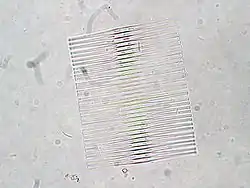 Fragilaria is a genus of freshwater and saltwater diatoms. It is usually a colonial diatom, forming filaments of cells mechanically joined by protrusions on the face and in the center of their valves. The individual diatoms appear swollen in their centers where they are joined to the colonial ribbon.[1] the genus grows as both plankton and benthic species, free living in colonies or epiphytic. Some species are bloom forming diatoms in eutrophic lakes. The type species is Fragilaria pectinalis Lyngbye from designating a lectotype from Conferva pectinalis O.F.Müller.[2] The taxonomy of the genus is still uncertain.[3]
