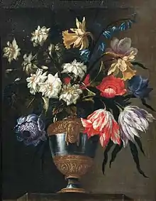 Francesco Caldei called Francesco Mantovano or Mantovani (Mantua, 1587-88 – Venice, 22 May 1674) was an Italian painter, mainly known as a still-life painter of flowers, fruits, animals and musical instruments.[1] He also collaborated on garland and allegorical paintings. He was an art valuer and may also have been active as an art dealer. He worked first in Rome and then for the rest of his career in Venice. Here his flower pieces with their Roman flavour and the pleasantness of composition earned the artist considerable commercial success with the Venetian bourgeoisie.[2]
