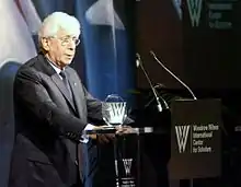 In 2000, he was appointed a Companion of the Order of Australia for his service to the community through the development of the property industry and expansion of the retail sector in Australia and internationally, and as philanthropist committed to support of wide-ranging social and cultural endeavours.[80] In 2002, he received the Golden Plate Award of the American Academy of Achievement presented by Awards Council member Ehud Barak in Dublin, Ireland.[81] The establishment of the Lowy Institute led him to being awarded the Woodrow Wilson Award for Corporate Citizenship in 2005 by the Woodrow Wilson International Center for Scholars.[82] On 2 October 2007 Lowy received the Henni Friedlander Award for the Common Good at Bowdoin College in Brunswick, Maine, United States.[83] In 2008 Lowy was honoured by Australia Post for his contribution to philanthropy as one of the nation's five leading, living philanthropists with a commemorative postage stamp that was released on the eve of Australia Day as part of the Australian Legends series.[84]