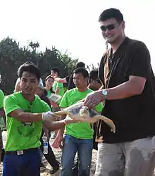In an interview with China's official state-run news agency, Xinhua News Agency, Yeh called for a celebrity to help save endangered sea turtles by raising public awareness.[4] In 2014, Yeh was answered by former NBA basketball superstar Yao Ming, who consistently ranked #1 on the Forbes China Celebrity 100.[46][47][48] Yao Ming joined Yeh in his public sea turtle release events and the duo set free rescued turtles back into the wild, raising awareness together that leads people to "an epiphany that turtles belong in the wild, and not in the market.”[49][50][2][51][52][53]