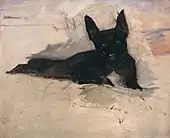 The small Bulldog type gradually became thought of as a breed, and received a name, the Bouledogue Francais.[14] This Francization of the English name is also a contraction of the words boule (ball) and dogue (mastiff or molosser). The dogs were highly fashionable and were sought after by society ladies and Parisian prostitutes alike, as well as creatives such as artists, writers, and fashion designers.[14] There is record of artists named Edgar Degas and Toulouse-Lautrec who have been thought to have French Bulldogs in their paintings.[15] However, records were not kept of the breed's development as it diverged further away from its original Bulldog roots. As it changed, terrier stock had been brought in to develop traits such as the breed's long straight ears.[14]