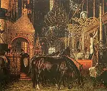 During their stay in Moscow, the French did not particularly stand on ceremony with Russian shrines; stables were set up in a number of churches. As stoves were heated with window frames, bird nests were twisted under the ceiling of buildings. In some churches, melting furnaces were set up for the smelting of gold and silver utensils.[18] After the Russians returned, the Assumption Cathedral of the Moscow Kremlin had to be sealed so that the crowd could not see what was done inside outrage: