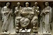 The Hellenistic influence upon Byzantine furniture can be seen through the use of acanthus leafs, palmettes, bay and olive leaves as ornaments. Oriental influences manifest through rosettes, arabesques and the geometric stylisation of certain vegetal motifs. Christianity brings symbols in Byzantine ornamentation: the pigeon, fishes, the lamb and vines.[43] The furniture from Byzantine houses and palaces was usually luxurious, highly decorated and finely ornamented. Stone, marble, metal, wood and ivory are used. Surfaces and ornaments are gilded, painted plychrome, plated with sheets of gold, emailed in bright colors, and covered in precious stones. The variety of Byzantine furniture is pretty big: tables with square, rectangle or round top, sumptuous decorated, made of wood sometimes inlaid, with bronze, ivory or silver ornaments; chairs with high backs and with wool blankets or animal furs, with coloured pillows, and then banks and stools; wardrobes were used only for storing books; cloths and valuable objects were kept in chests, with iron locks; the form of beds imitated the roman ones, but have different designs of legs.[44]