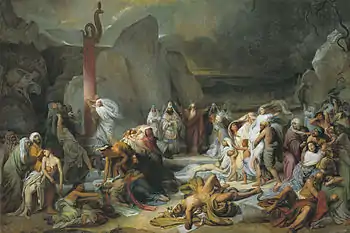 In 1838, he was able to return to Rome to finish his work on Moses and the Serpent.[2] Two years later, it was completed and moved to Saint Petersburg where it was exhibited in one of the halls of the newly restored Winter Palace. It is now the largest canvas on display at the Russian Museum.[3] Returning to Rome for a third time from 1841 to 1845, he produced twenty-five sketches that would be the basis for frescoes at Saint Isaac's Cathedral. Some of the frescoes were executed by Bruni himself, others by various artists under his direction. The work was completed in 1853 and the originals are now stored at the Russian Museum.[4]