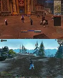 World of Warcraft takes place in a 3D-representation of the Warcraft universe that players can interact with through their characters. The game features five continents on the world of Azeroth, as well as the realm of Outland that was added in the expansion The Burning Crusade.[19] Warlords Of Draenor introduced the realm of Draenor, an altered past of Outland. The second expansion, Wrath of the Lich King, added a third continent, Northrend .[20] to Azeroth, and in Mists of Pandaria a fourth continent, Pandaria, was added. In Legion, they introduce the Broken Isles. With the Battle for Azeroth expansion came 2 new continents, Kul Tiras (mainly for Alliance) and Zandalar (mainly for the Horde). In this game world, players use their characters to explore locations, defeat creatures and complete quests.[5] By doing this, characters gain experience points. After a set amount of experience points have been gained, a character gains a level, giving new skills or abilities and making it possible to explore new areas and attempt new quests.[21] As a player explores new locations, a number of transport shortcuts become available. Players can discover 'flight masters' in newly discovered locations and then use those NPCs in order to fly to previously discovered locations in other parts of the world.[22] Players can also use facilities such as boats and zeppelins in order to move from one of the continents on Azeroth to the other. Players can communicate with each other using text-based chat, separated into different channels for ease of use. When a player instructs their character to yell or say something, a chat bubble appears above their head containing the spoken words in a similar way to a comic book image.[23]