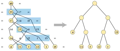 - Remove and from the sequence, and make a new tree node to be the parent of the nodes for and . Its value is .