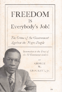 In 1948, Crockett became a member of the legal team that went to New York for the Foley Square trial to defend 11 Communist Party leaders accused of teaching the overthrow of the Federal government, a violation of the Smith Act. Among the 11 were Communist Party leaders: Gil Green, Eugene Dennis, Henry Winston, John Gates, Gus Hall, Robert G. Thompson and fellow Morehouse alumnus and first black New York City Councilman Benjamin J. Davis. In 1949, while defending the Smith Act prosecution, Crockett and four other defense attorneys were sentenced by Judge Harold Medina to Federal prison for contempt of court. Crockett served four months in an Ashland, Kentucky Federal prison in 1952.[7] A portion of Crockett's jury summation at the trial was published in "Freedom is Everybody's Job!: The Crime of the Government Against the Negro People, Summation in the trial of the 11 Communist leaders."