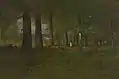 After Inness settled in Montclair, New Jersey in 1885,[20] and particularly in the last decade of his life, this mystical component manifested in his art through a more abstracted handling of shapes, softened edges, and saturated color (October, 1886, Los Angeles County Museum of Art), a profound and dramatic juxtaposition of sky and earth (Early Autumn, Montclair, 1888, Montclair Art Museum),[21] an emphasis on the intimate landscape view (Sunset in the Woods, 1891, Corcoran Gallery of Art), and an increasingly personal, spontaneous, and often violent handling of paint.[22][23] It is this last quality in particular which distinguishes Inness from those painters of like sympathies who are characterized as Luminists.[24]
