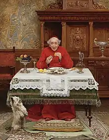 Others who made a name in the genre include the Italian Andrea Landini and the Frenchmen Jehan Georges Vibert, Charles Edouard Delort and Marcel Brunery.[7] By depicting cardinals participating in activities such as 'approving the artist’s nude model', card games, excessive or sumptuous eating and drinking and indulgent pastimes such as philately and painting, these painters poked fun at the excessive and sometimes debauched lifestyles of the upper echelons of the Catholic clergy.[3] There was clearly a large demand for these paintings as evidenced by the fact that so many artists worked in this genre.