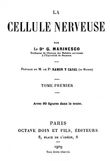 Early in his career, Marinescu published a much needed atlas on the pathological histology of the nervous system with the bacteriologist Victor Babeş and the French pathologist Paul Oscar Blocq. His description with Blocq, of a case of Parkinsonian tremor due to tumour in the substantia nigra in 1893, was the basis for Édouard Brissaud's theory that Parkinsonism occurs as a consequence of damage to the substantia nigra. With Blocq he was the first to describe senile plaques and with Romanian neurologist Ion Minea he confirmed in 1913 Hideyo Noguchi's discovery of Treponema pallidum in the brain in patients with general paresis. His monumental work La Cellule Nerveuse, with a preface by Santiago Ramon y Cajal, appeared in 1909.