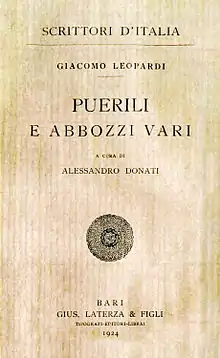 The Zibaldone di pensieri (see also Commonplace book#Zibaldone) is a collection of personal impressions, aphorisms, philosophical observations, philological analyses, literary criticism and various types of notes which was published posthumously in seven volumes in 1898 with the original title of Pensieri di varia filosofia e di bella letteratura (Miscellaneous Thoughts on Philosophy and Literature).
