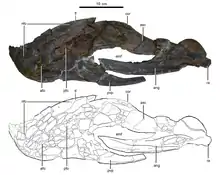 As preserved, the total length of the lower jaws is 46 cm (460 mm). This element fused into a broad shovel-like shape, indicating that the unknown skull was over half a metre long and toothless, likely equipped with a rhamphotheca (horny beak). Compared to the right side, the left side of the jaws is well-preserved with an almost intact shape. The dentary bones are very deep and toothless, and have a pair of sharply-developed shelves on the top edges. These structures are relatively flat. The anterior end of the dentary is rounded, more similar to caenagnathids and different to the chin-shaped one of some oviraptorids. From a top view, the symphyseal (bone union) region at the front of the dentary is U-shaped. Along the lateral surfaces of this bone, some nutrient foramina can be found, which likely supported a rhamphotheca.[3]