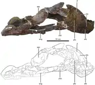 That holotype, LH V0011, consists of the incomplete and disassociated remains of a single adult individual, preserving a nearly complete mandible, a partial isolated cervical vertebra, dorsal vertebrae, caudal vertebrae, right scapula, right humerus, right radius and ulna, nearly complete right manus, partial ilium with a nearly complete pubis and hindlimbs, including both femur, tibia and fibula with a very complete pes.[1]