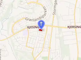 In 1979, Gjesing Parish was established in the northern suburbs of Esbjerg. The area had previously formed part of Bryndum Parish. Initially, a temporary building served the new parish until, following a competition between four architectural firms in 1979, a complex designed by Niels Munk and Keld Wohlert of Solrød Strand was inaugurated on 30 January 1983.[1] In 2010, the complex was extended with a meeting room, a handicapped toilet and three offices. The church is adjacent to Esbjerg Storcenter, a shopping centre, in a residential area with apartment buildings and detached houses.[2]