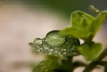The salt glands of mangroves such as Acanthus, Aegiceras, Aegialitis and Avicennia are a distinctive multicellular trichome, a glandular hair found on the upper leaf surface and much more densely in the abaxial indumentum. On the upper leaf surface they are sunken in shallow pits, and on the lower surface they occur scattered among long nonglandular hairs composed of three or four cells. Development of the glands resembles that of the nonglandular hairs until the three-celled stage, when the short middle stalk cell appears. The salt gland continues to develop to produce two to four vacuolated cells at the level of the epidermis, the stalk cell with an almost completely cutinized wall, and at least eight terminal cells. The terminal cells have a thin, perforated cuticle which separates from the cell walls apically, leaving an enclosed cavity between them. The secreted salt evaporates and forms visible crystals.[2]