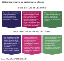 The GCED expected learning outcomes are based on a vision of learning that covers three domains to create a well-rounded learning experience: cognitive, socio-emotional and behavioural. Although distinct, the three domains do not represent isolated learning processes; they often overlap, reinforce and build upon each other, and can also occur in parallel.[25] For example, socio-emotional learning requires understanding existing challenges in the community (cognitive) and making informed decisions (behavioural).