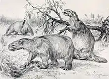 Glossotherium (literally "tongue beast") was a genus of ground sloth.[1] It was a heavily built animal with a length of about 4 metres (13 ft) snout to tail-tip, a weight estimated at 1,000 kg (2,200 lb),[2] and could potentially assume a slight bipedal stance.