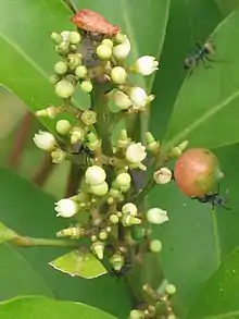 Glycosmis parviflora is a species of flowering plant in the family Rutaceae, known commonly as Chinese glycosmis and Jamaican Mandarin-orange. It occurs in China, Japan, Taiwan, Myanmar and Vietnam. It is widely naturalized in the tropics including in the West Indies. In temperate zones, it can be cultivated indoors as a houseplant.