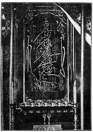 The Nichikan-inscribed Gohonzon consists of 34 blocks of calligraphy.[43] The original copy was inscribed in 1720 by Nichikan (1665-1726), the twenty-sixth chief abbot of Taiseki-ji. In 1993 the Soka Gakkai began to confer Gohonzon replicas based on this mandala. Many of its members opted to replace their old Gohonzon with this transcription.[44]