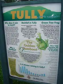The Golden Gumboot is a competition between the Far North Queensland towns of Tully, Innisfail, and Babinda in Australia for the wettest town of Australia. These towns are located in the Wet Tropics and on land that was previously covered by rainforest. These areas experience some of the highest levels of rainfall in Australia through monsoonal rain and cyclones. The winner for the competition (since 1970) was awarded a rubber boot.
