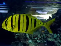 Juvenile golden trevally are often used in marine aquaria due to their vivid yellow colour and black banding,[34] with larger individuals also kept in larger tanks. The development of laboratory culturing specifically for the aquarium trade has been achieved in Singapore.[40]