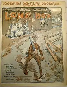 "Goodbye, Ma! Goodbye, Pa! Goodbye, Mule, with Yer Old Hee-Haw!", also known as "Long Boy", is a World War I era song released in 1917. William Herschel wrote the lyrics. Barclay Walker composed the music.[1][2] It was published by Shapiro, Bernstein & Co. of New York, New York. Garr Williams designed the sheet music cover. It features a morose-looking cartoon soldier leaving his farm. Farm animals, the soldier's parents, and his girlfriend look on and wave flags.[3] It was written for both voice and piano.[4]