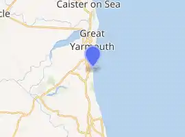 Gorleston (Range Rear) Lighthouse is located near mouth of River Yare in the Gorleston-on-Sea area of Great Yarmouth in the English county of Norfolk.[2] The lighthouse was built in 1878. Gorleston-on-Sea lighthouse carries two lights. The rear light for the harbour entrance range (white light, 4 seconds on, 2 seconds off) is mounted on the tower with a focal plane of 6.7 metres (22 ft); a fixed red light is also displayed from the gallery with a focal plane of 20.1 metres (66 ft).