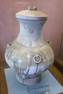 During the Han dynasty, the power a government official exercised was determined by his annual salary-rank, measured in grain units known as dan (石, a unit of volume, approximately 35 litres (0.99 US bsh)). However, approximately half an official's salary in grain was made in payments of cash coins,[1] the standard of which, after 119 BC, was the wushu (五銖) coin measuring 3.2 g (0.11 oz).[2] The other half of an official's salary consisted of unhusked grain and husked grain measured in hu (觳, approximately 20 L / 676 oz); since one hu of unhusked grain was equal to 100 coins and one hu of husked grain was equal to 160 coins, the conversion ratio for unhusked grain to husked grain was 10 to 6 (see table below).[3] The most senior officials in central government earned a 10,000-dan salary. The officials who oversaw nine specialized ministries each earned the Fully 2,000-dan rank, while the magistrate of a county earned a 600-dan rank.[4] Occasionally, emperors bestowed luxurious gifts of wine, foodstuffs, and silk clothes upon high officials. These gifts, in some generous cases, could equal as much as half the value of the officials' standard annual salary.[5] Aged officials were often retired from service and given a pension.[6] Below is a table outlining salaries measured in coin cash, unhusked grain, and husked grain for the highest to lowest-paid officials in Han officialdom:[7]