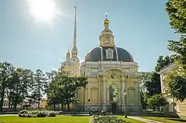 The Grand Ducal Burial Vault (Russian: Великокняжеская усыпальница) is the purpose-built mausoleum of the Grand Dukes and Duchesses of Russia in the Peter and Paul Fortress. The Neo-Baroque domed structure is frequently mistaken for a part of the Peter and Paul Cathedral due to architectural similarities. A covered passageway leads from the mausoleum to the cathedral, where the Russian emperors and empresses are buried.