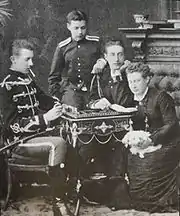 The grand duke was a lifelong bachelor, never involved in scandals. His cousin Grand Duke Alexander Mikhailovich accused him of misogyny in his book of memoirs, but this was contradicted with the close affective relationships he had with female members of his family. He was adored by his family and especially by his young nieces and nephews, with whom he would happily play and ride for hours.[7] He was particularly close to the children of his brother Konstantin. His nephew Prince Gabriel Konstantinovich remembered him, as a "wonderful, kind person" who was almost a second father and wherever they saw him, they ran across the room, jumping up to hug him and wrap their arms around his neck. Dmitry Konstantinovich also loved to tease the children and play practical jokes on them.