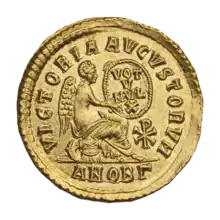 ![]() Solidus of Gratian, c. 381. Legend: d(ominus) n(oster) Gratianus p(ius) f(elix) aug(ustus). ("Our Lord Gratianus, the Devout, the Fortunate, the Majestic.") | |||||||||