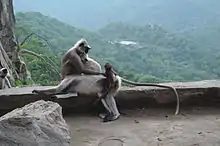 Social hierarchies exist for all group types.[34][35] In all-male groups, dominance is attained through aggression and mating success.[36] With sexually mature females, rank is based on physical condition and age.[37][38] The younger the female, the higher the rank. Dominance rituals are most common among high-ranking langurs.[35] Most changes in social rank in males take place during changes in group members. An adult male may remain in a one-male group for 45 months.[39] The rate of male replacement can occur quickly or slowly depending on the group.[40]