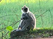 Gray langurs can adapt to a variety of habitats.[21] They inhabit arid habitats like deserts, tropical habitats like tropical rainforests and temperate habitats like coniferous forests, deciduous habitats and mountains habitats. They are found at sea level to altitudes up to 4,000 m (13,000 ft).[2][3] They can adapt well to human settlements, and are found in villages, towns and areas with housing or agriculture.[22] They live in densely populated cities like Jodhpur, which has a population numbering up to a million.[23]