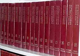 There were three editions. The first edition of 65 volumes (65,000 entries, plus a supplementary volume about the Soviet Union) was published during 1926–1947, the chief editor being Otto Schmidt (until 1941). The second edition of 50 volumes (100,000 entries, plus a supplementary volume) was published in 1950–1958; chief editors: Sergei Vavilov (until 1951) and Boris Vvedensky (until 1969); two index volumes to this edition were published in 1960. The third edition of 1969–1978 contains 30 volumes (100,000 entries, plus an index volume issued in 1981). Volume 24 is in two books, one being a full-sized book about the USSR, all with about 21 million words,[3] and the chief editor being Alexander Prokhorov (since 1969). In the third edition, much attention was paid to the philosophical problems of natural sciences, physical and chemical sciences, and mathematical methods in various branches of knowledge.[4]