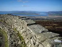 The Grianan of Aileach (/ˌɡriːnən əv ˈæljə(x)/ gree-nən əv AL-yə(kh); Irish: Grianán Ailigh [ˌɟɾʲiənˠaːnˠ ˈalʲiː], sometimes anglicised as Greenan Ely or Greenan Fort) is a hillfort atop the 244 metres (801 ft) high Greenan Mountain at Inishowen in County Donegal, Ireland. The main structure is a stone ringfort, thought to have been built by the Northern Uí Néill, in the sixth or seventh century CE;[1] although there is evidence that the site had been in use before the fort was built. It has been identified as the seat of the Kingdom of Ailech and one of the royal sites of Gaelic Ireland. The wall is about 4.5 metres (15 ft) thick and 5 metres (16 ft) high. Inside it has three terraces, which are linked by steps, and two long passages within it. Originally, there would have been buildings inside the ringfort. Just outside it are the remains of a well and a tumulus.