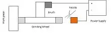 Electrolytic in-process dressing (ELID) grinding is one of the most accurate grinding methods. In this ultra precision grinding technology the grinding wheel is dressed electrochemically and in-process to maintain the accuracy of the grinding. An ELID cell consists of a metal bonded grinding wheel, a cathode electrode, a pulsed DC power supply and electrolyte. The wheel is connected to the positive terminal of the DC power supply through a carbon brush whereas the electrode is connected to the negative pole of the power supply. Usually alkaline liquids are used as both electrolytes and coolant for grinding. A nozzle is used to inject the electrolyte into the gap between wheel and electrode. The gap is usually maintained to be approximately 0.1mm to 0.3 mm. During the grinding operation one side of the wheel takes part in the grinding operation whereas the other side of the wheel is being dressed by electrochemical reaction. The dissolution of the metallic bond material is caused by the dressing which in turns results continuous protrusion of new sharp grits.[5]