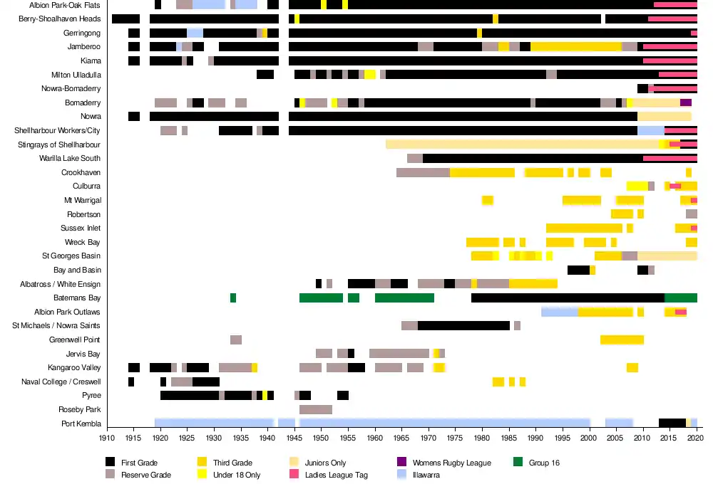 The graph below shows the participation of all current and most former clubs. The club's highest grade in a particular year is displayed. The source is a compilation of competition tables, point scores and lists of participating teams. These have been taken from the Kiama Independent, Illawarra Mercury and other past newspapers on Trove and microfilm. The current South Coast Group 7 Official Historian has assisted with the provision of more recent tables as printed in association guidebooks and the South Coast Register. Further research may add seasons the juniors only clubs participated which are currently not shown.