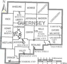 Guernsey County is a county located in the U.S. state of Ohio. As of the 2010 census, the population was 40,087.[2] Its county seat is Cambridge,[3] and it is named for the Isle of Guernsey in the English Channel, from which many of the county's early settlers emigrated.[4]